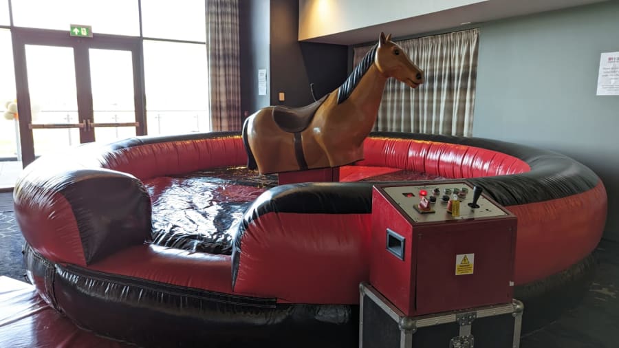 This is most certainly our best rodeo attachment we have available from JM Entertainment. If you think you are a horse riding expert then why not show off your skills and try out our rodeo horse. Our rodeo horse has been used in many horse racing tracks up and down the country including Newbury, Ascot & the Chepstow race courses.. The aim of the game is very simple, the riders must mount the rodeo horse unaided and hold as tight to the horse as you possibly can. Our operator will try their best to make sure to knock you off while the rodeo will be spinning, bucking with ever-increasing levels of difficulty. While all this is happening our rodeo ride has a built in timer where we can run a competition with your guests and announce the winners at the end of your event.